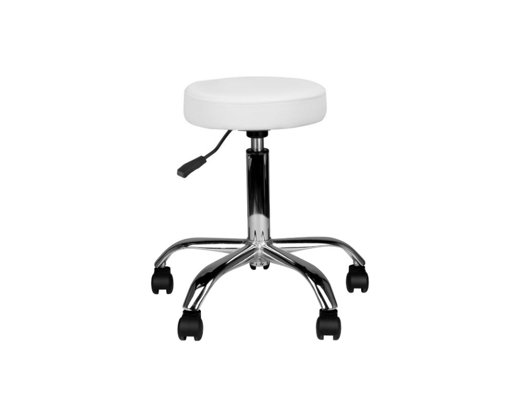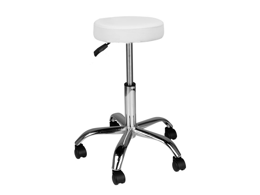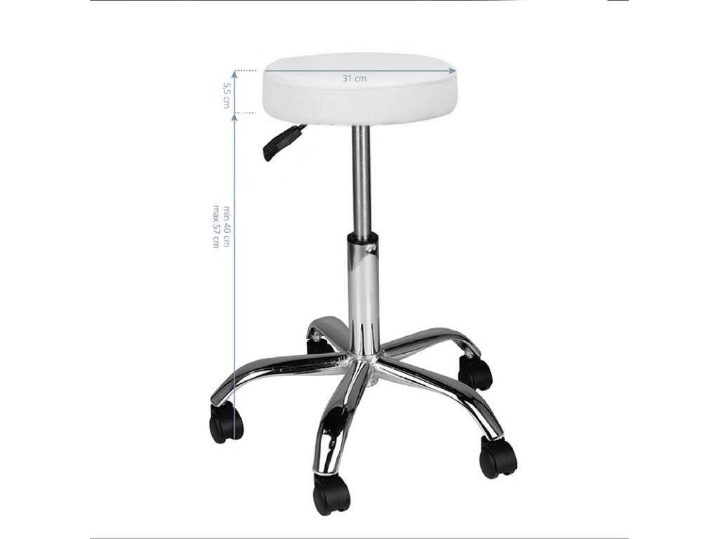 Das stabile 5-armige Untergestell sorgt für Sicherheit und Standfestigkeit, während die Gummiräder ein leichtes und leises Verschieben im Behandlungsraum ermöglichen. Der Sitz ist mit weißem, pflegeleichtem Kunstleder bezogen, das sich leicht reinigen lässt und widerstandsfähig gegen Feuchtigkeit und Kosmetikprodukte ist.