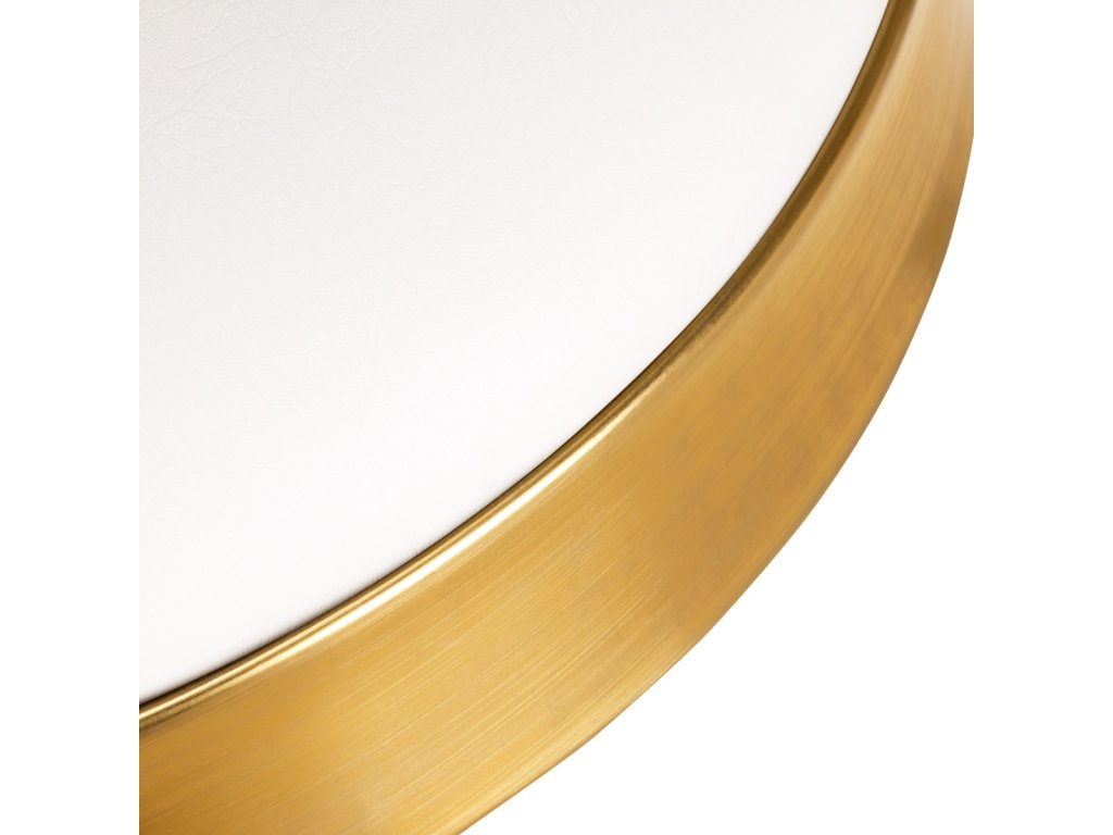 Dank der leichtlaufenden Kunststoffrollen lässt sich der Hocker mühelos im Raum bewegen, ohne Kratzer auf dem Boden zu hinterlassen. Die matt lackierten goldenen Metallelemente unterstreichen das moderne Design – bitte beachten Sie, dass mechanische Beschädigungen an der Beschichtung nicht reklamierbar sind.