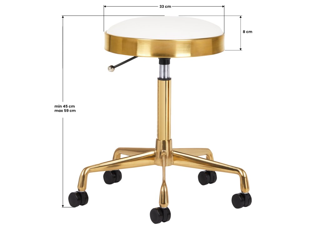 Die stabile fünfzackige Basis aus widerstandsfähiger Metalllegierung in edler Goldoptik verleiht dem Hocker eine elegante Note und sorgt gleichzeitig für Sicherheit und Langlebigkeit. Die Sitzhöhe ist mithilfe des Gaslifts einfach und stufenlos verstellbar zwischen 45 cm und 59 cm, um eine optimale ergonomische Arbeitsposition zu ermöglichen.