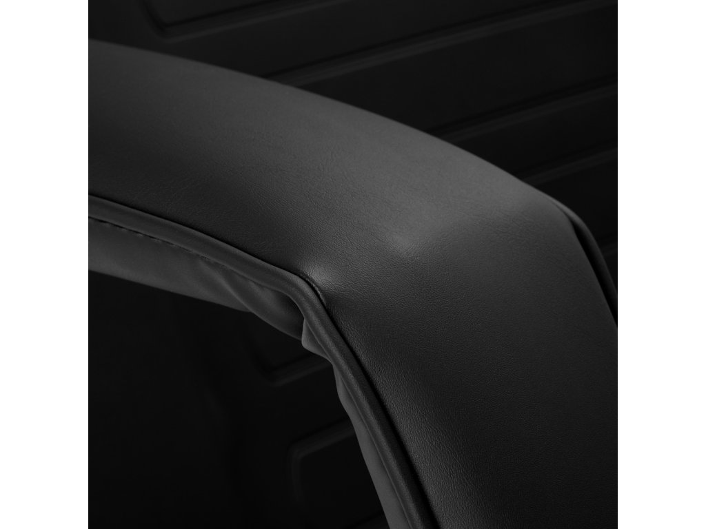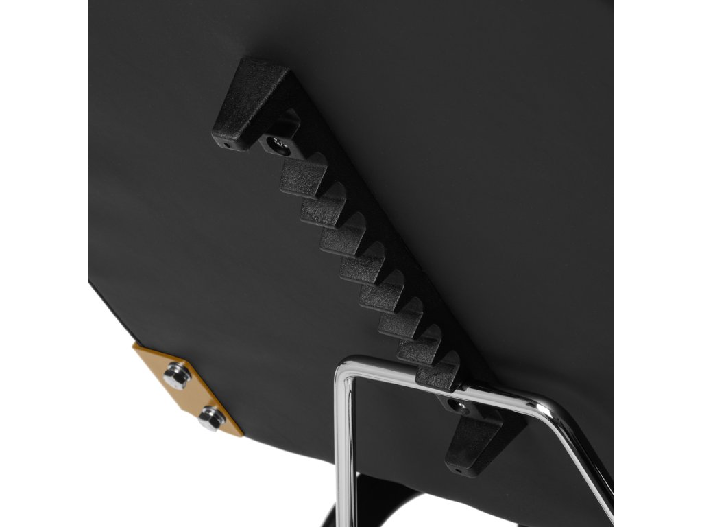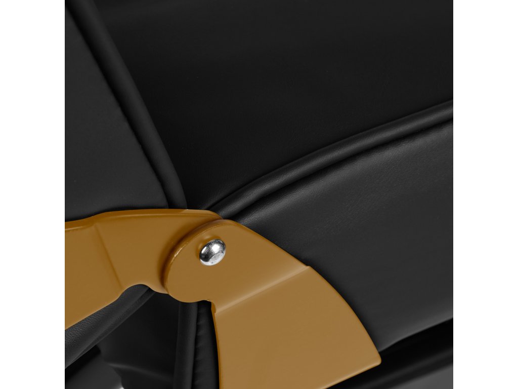 Das Metallgestell – dank der seidenmatten Oberfläche in Altgoldtönen und stromlinienförmig konturierten Beinen – wirkt elegant und überfordert den Raum nicht. Die Basis des Stuhls hat eine feste Höhe, so dass sich der Sitz auf einer konstanten Höhe befindet, was den Komfort während des Gebrauchs gewährleisten sollte. Der Stuhl ist mit Schaumstoff gefüllt und mit Kunstleder in Schwarztönen bezogen. Dank der Verwendung dieses Materials ist das Gerät angenehm zu bedienen, feuchtigkeitsbeständig und leicht zu reinigen. Richtig profilierte Säume verleihen dem Sitz eine ergonomische Form. Einfaches Design und klassische Farben ermöglichen es, in jedes Interieur zu passen.