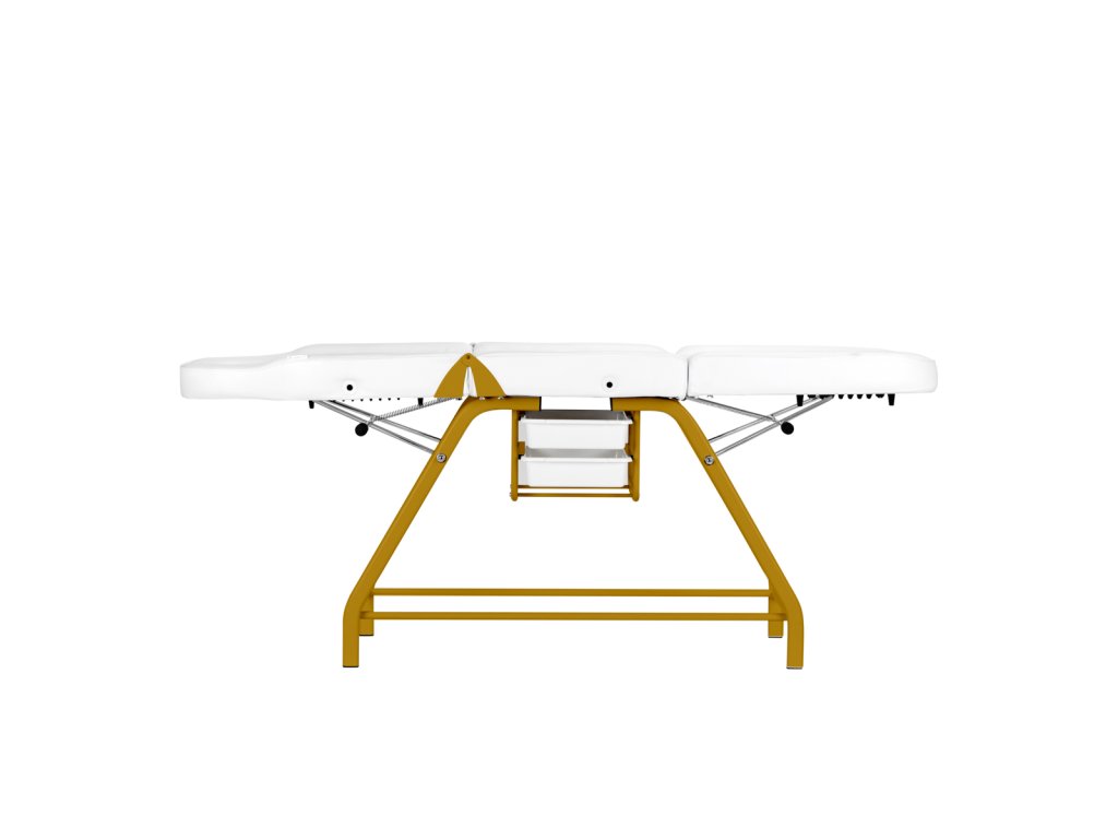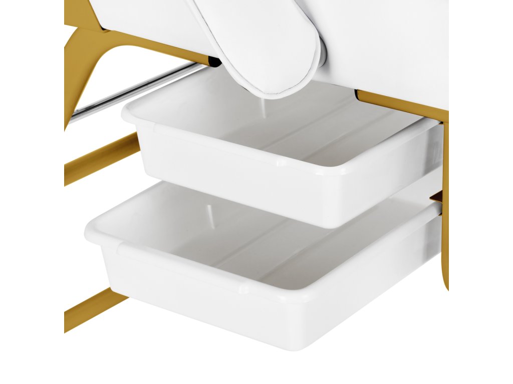 Praktische Kunststoffküvetten, die unter dem Sitz platziert sind, bieten einfachen Zugang zu den notwendigsten Instrumenten. Ausziehbehälter sind langlebig und leicht zu reinigen und tragen zusätzlich dazu bei, den Arbeitsplatz sauber zu halten. Dank des Lochs in der Kopfstütze, das unter einem gut profilierten Kissen versteckt ist, eignet sich der Stuhl perfekt für Behandlungen, die auf dem Rücken durchgeführt werden, wie z.B. Massagen.
