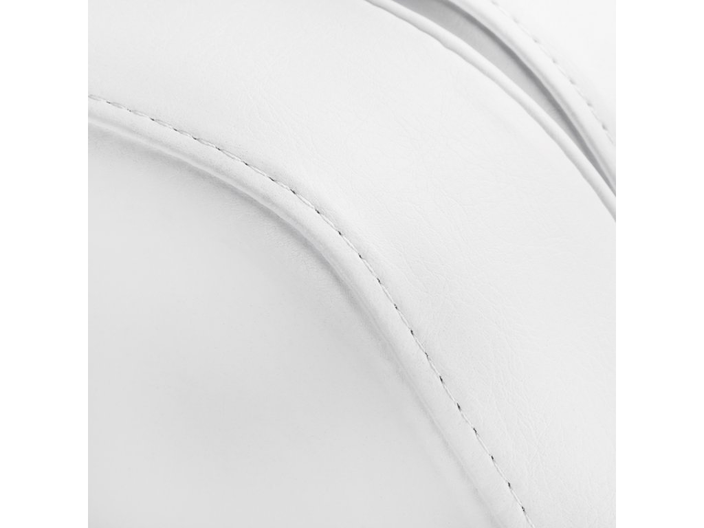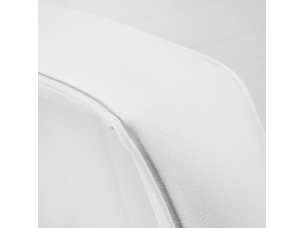 Das Metallgestell – dank der seidenmatten Oberfläche in Altgoldtönen und stromlinienförmig konturierten Beinen – wirkt elegant und überfordert den Raum nicht. Die Basis des Stuhls hat eine feste Höhe, so dass sich der Sitz auf einer konstanten Höhe befindet, was den Komfort während des Gebrauchs gewährleisten sollte. Der Stuhl ist mit Schaumstoff gefüllt und mit Kunstleder in Weißtönen bezogen. Dank der Verwendung dieses Materials ist das Gerät angenehm zu bedienen, feuchtigkeitsbeständig und leicht zu reinigen. Richtig profilierte Säume verleihen dem Sitz eine ergonomische Form. Einfaches Design und klassische Farben ermöglichen es, in jedes Interieur zu passen.