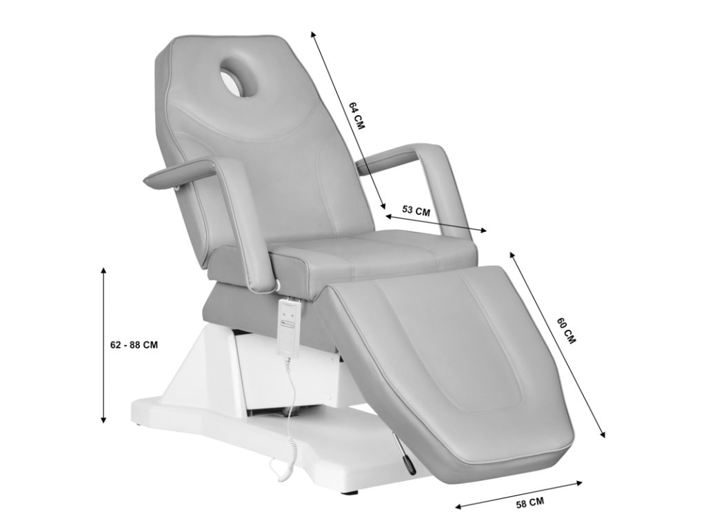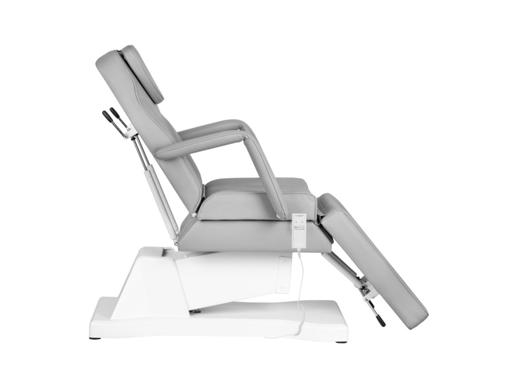 Extrem bequemer und stabiler Kosmetikstuhl mit einem elektrischen Aktuator, dank dem Sie die Position des Stuhls effizient einstellen können. Rückenlehne und Fußstützen lassen sich einfach manuell verstellen.