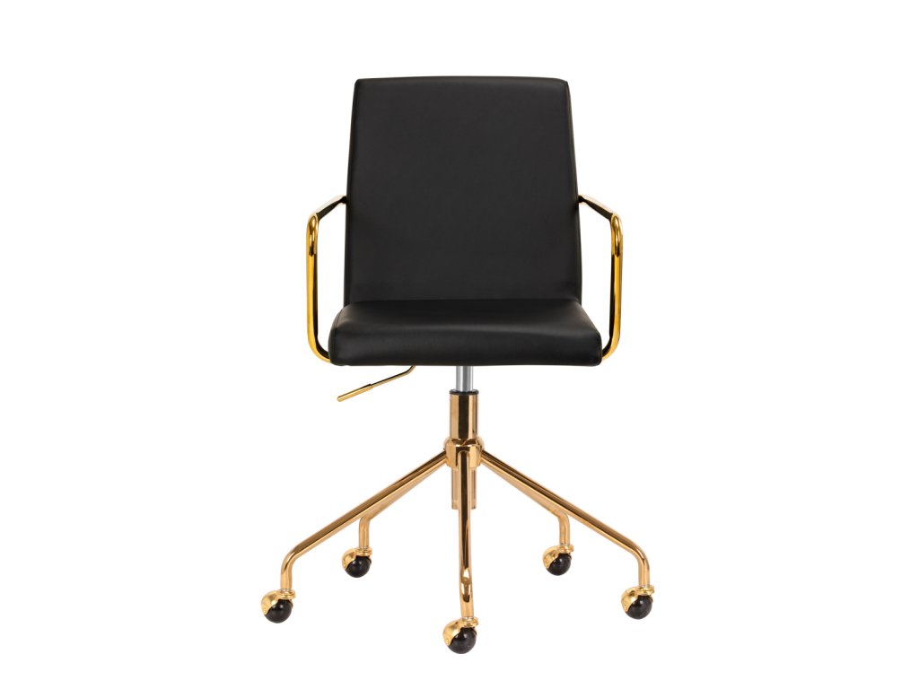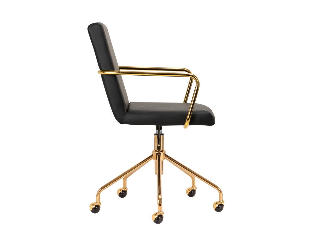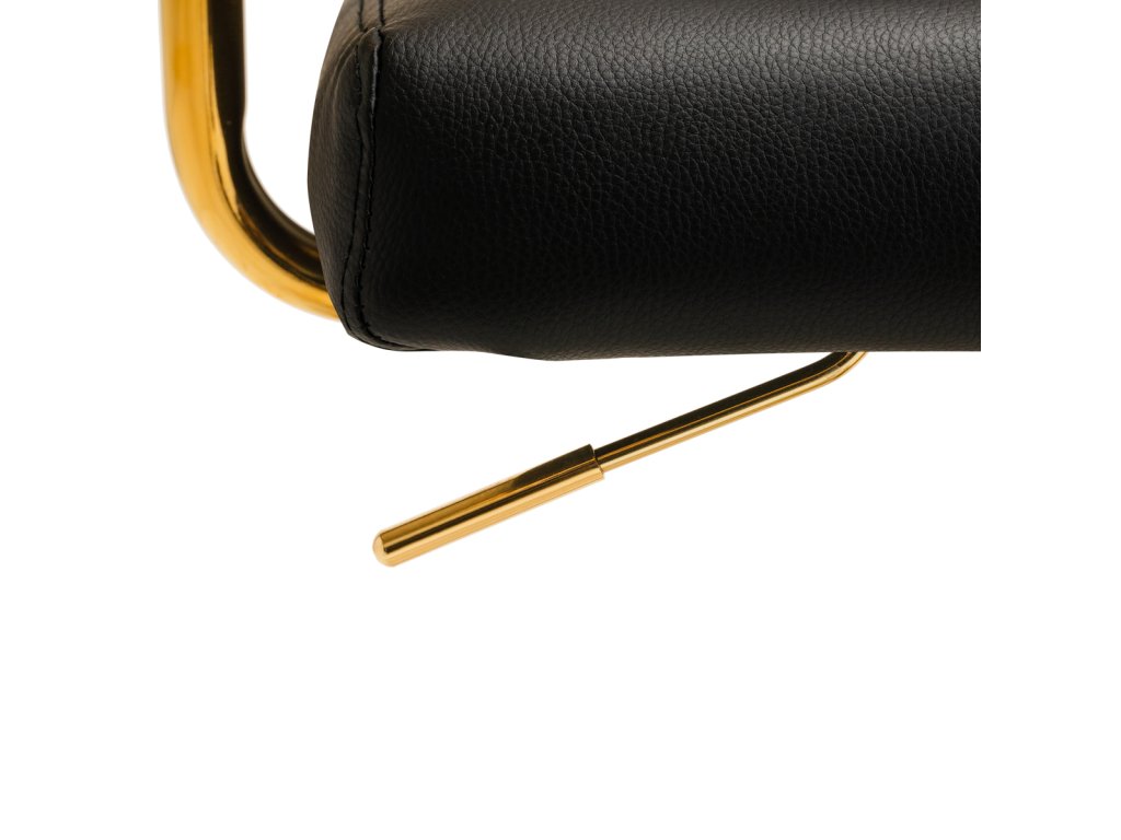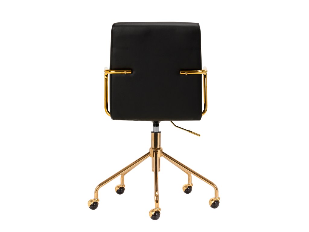 Die Kunstlederpolsterung in Schwarztönen fühlt sich angenehm an und verleiht den Möbeln einen einzigartigen Charakter. Die elegante Verarbeitung macht dieses Möbelstück zu einem echten Hingucker. Der Rahmen in Goldtönen sorgt für Eleganz und passt perfekt zu den schlichten Formen. Funktionelle Räder sorgen für eine hohe Mobilität und erleichtern das Bewegen des Stuhls und die Bewegung im Wohnzimmer während der Arbeit. Die Ästhetik der Verarbeitung, der Bedienkomfort und die ergonomisch profilierte Rückenlehne sorgen dafür, dass der Stuhl auch den Anforderungen der anspruchsvollsten Benutzer gerecht wird.