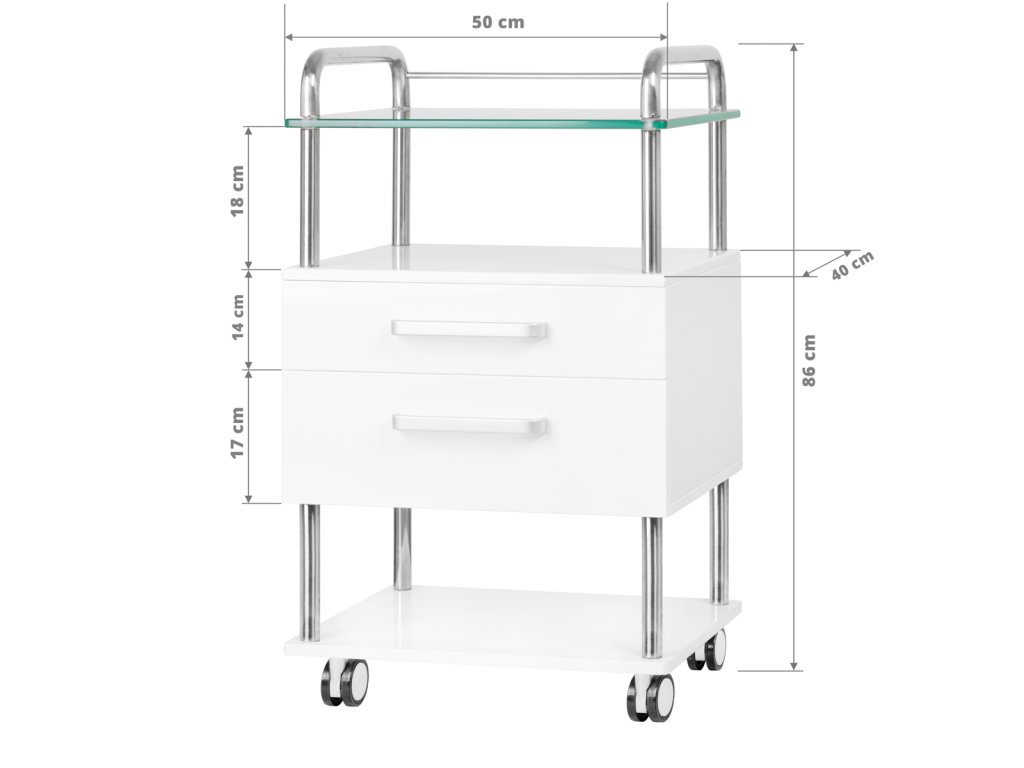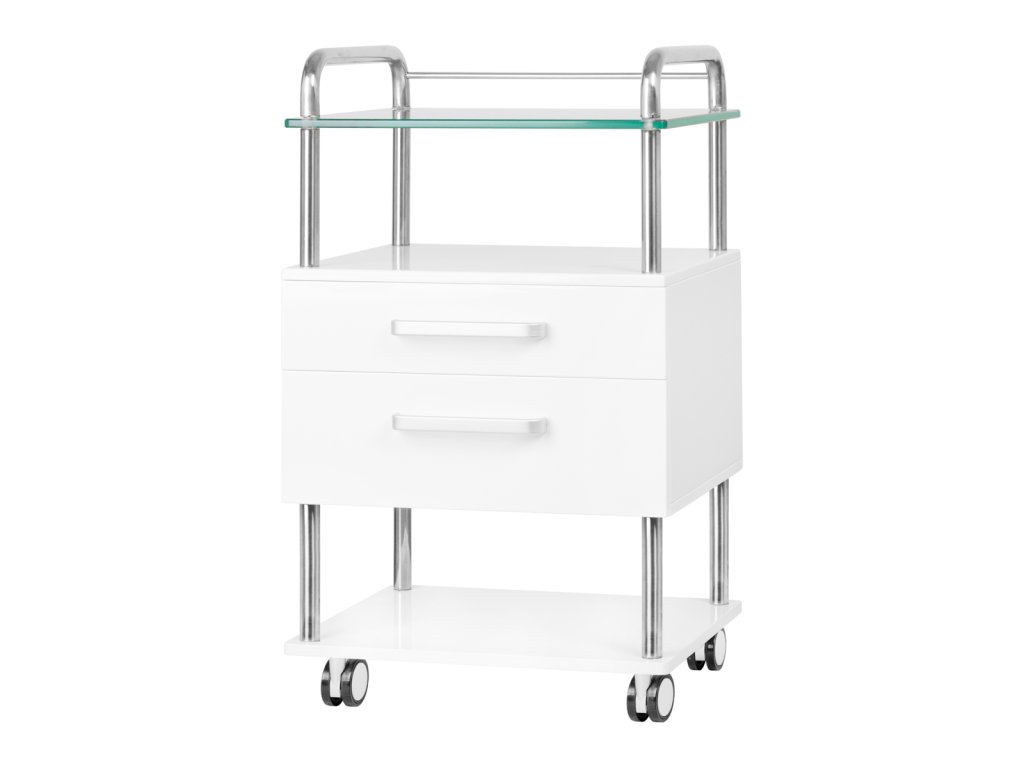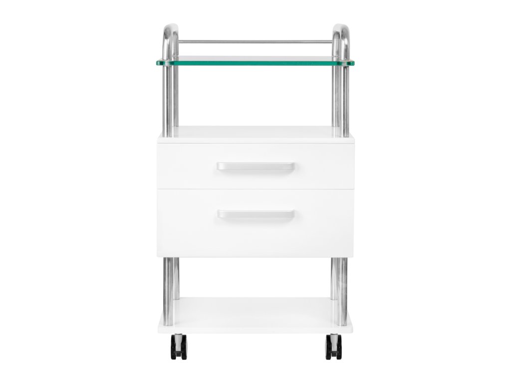 Ausgestattet mit zwei praktischen Schubladen bietet er ausreichend Stauraum für Werkzeuge und Zubehör. Die elegante Glasarbeitsplatte eignet sich perfekt für präzise Behandlungen und verleiht dem Möbelstück eine moderne, hygienische Optik. Ein zusätzliches Regal unterhalb bietet Platz für podologische Fräsgeräte oder andere professionelle Kosmetikgeräte.