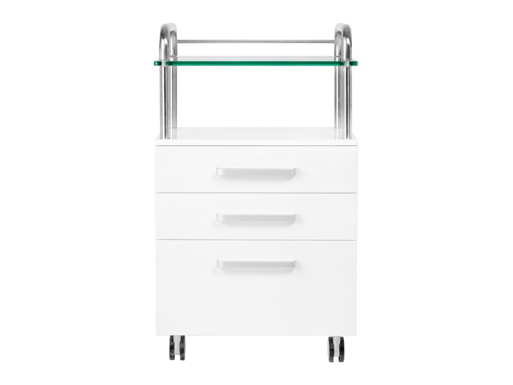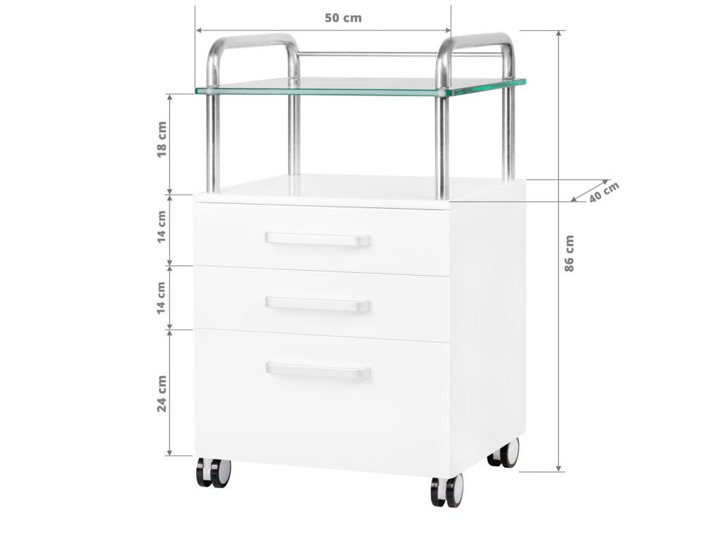 Die Glasarbeitsplatte sorgt nicht nur für ein elegantes Erscheinungsbild, sondern ist auch besonders leicht zu reinigen – ideal für tägliche Behandlungen. Drei geräumige Schubladen bieten großzügigen Stauraum für Werkzeuge, Kosmetikzubehör und Pflegeutensilien. Ein zusätzliches Regal im unteren Bereich eignet sich perfekt zur Platzierung podologischer Fräsmaschinen oder anderer professioneller Geräte.