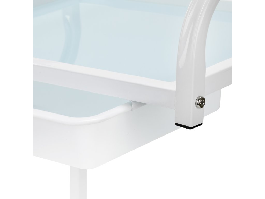 Das Gestell aus stabilem Aluminium in Weißtönen harmoniert perfekt mit den transparenten Glasflächen und sorgt für eine hygienische, leicht zu reinigende Oberfläche. Vier leichtgängige Rollen ermöglichen maximale Mobilität, während die robuste Bauweise eine hohe Lebensdauer und Stabilität garantiert.