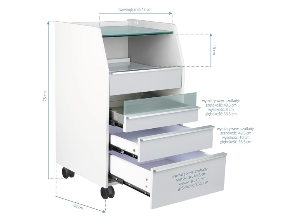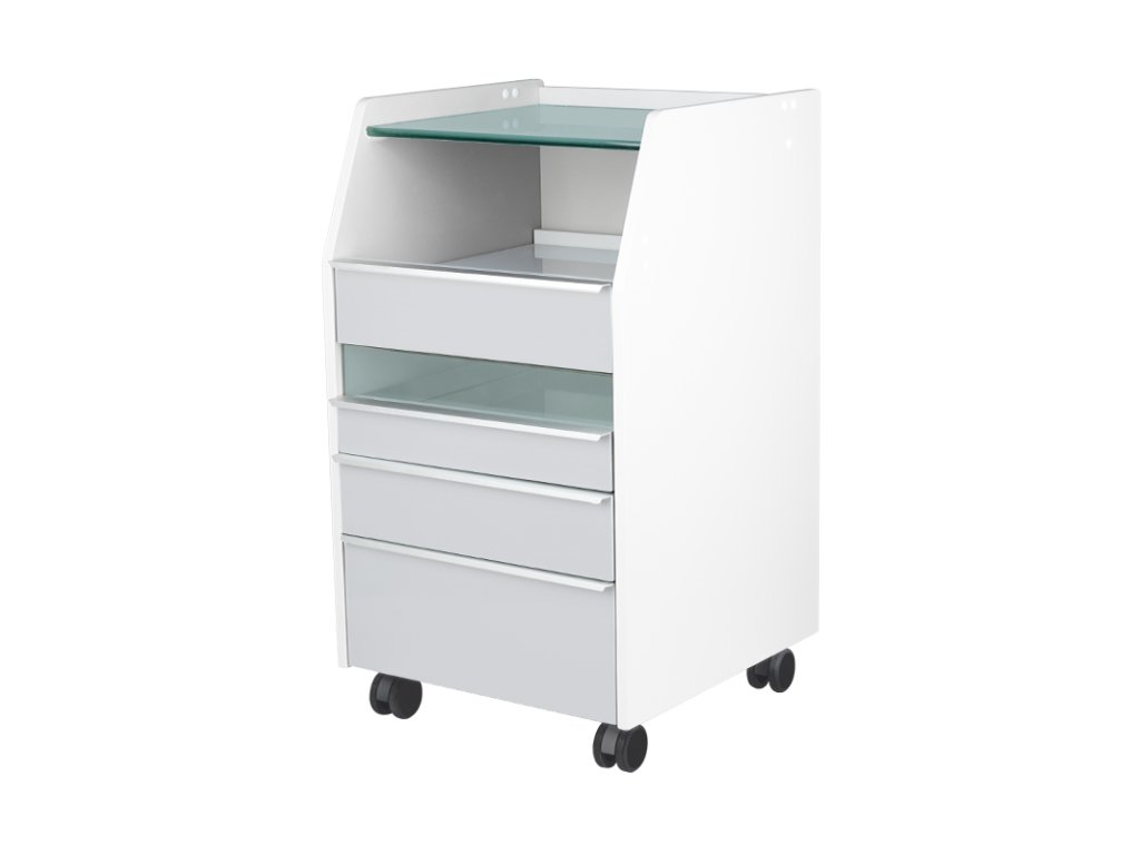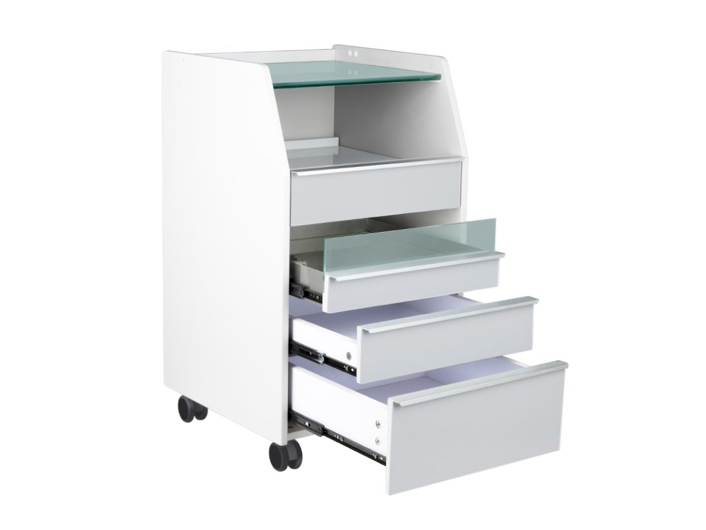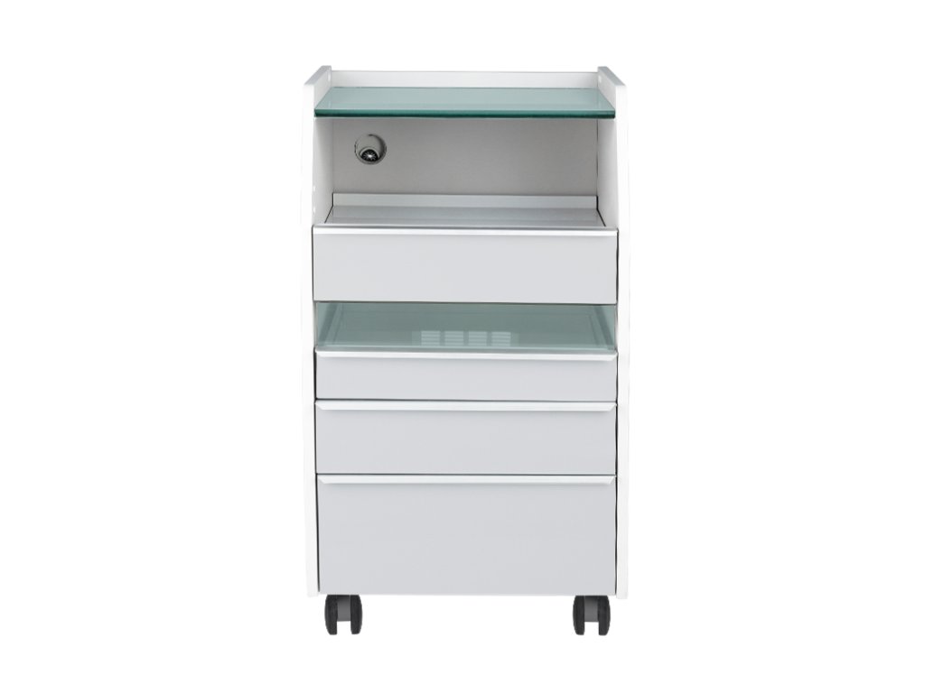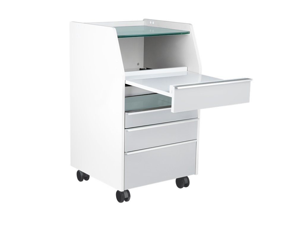 Ausgestattet mit einer robusten Glasarbeitsplatte, bietet der Wagen eine hygienische, pflegeleichte Oberfläche für Behandlungen. Mehrere Schubladen ermöglichen die strukturierte Aufbewahrung von Werkzeugen und Zubehör, während eine ausziehbare Ablage Platz für podologische Fräsgeräte oder andere professionelle Geräte schafft.