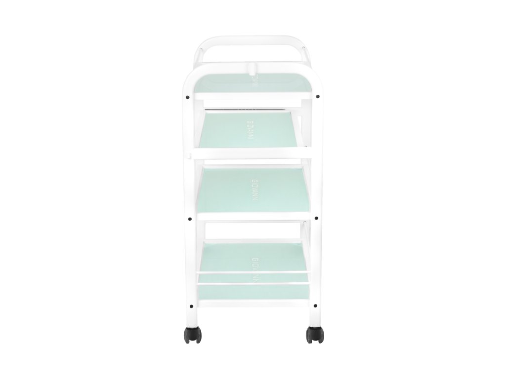 Der Kosmetikwagen Typ 1015 Giovanni Weiß ist ein hochwertiger, ästhetisch gestalteter Gerätewagen für den professionellen Einsatz in Kosmetik-, Beauty- und SPA-Studios. Die Kombination aus einem stabilen Metallgestell und vier eleganten Glasfächern mit eingraviertem GIOVANNI-Logo sorgt für ein modernes und hygienisches Erscheinungsbild.