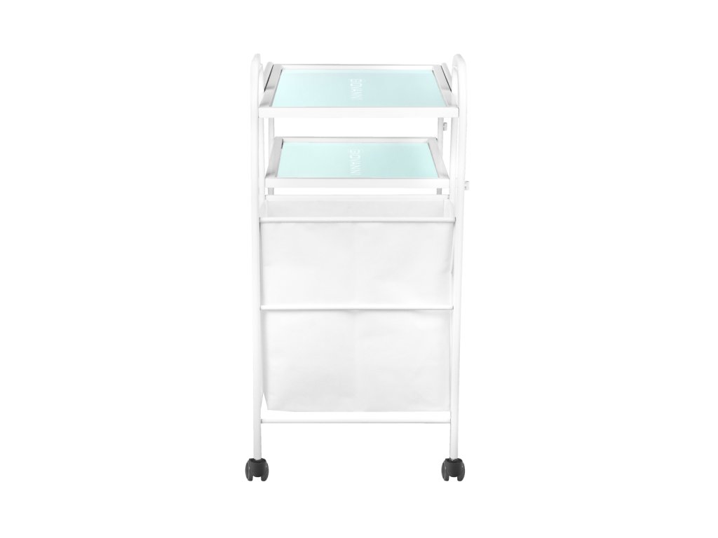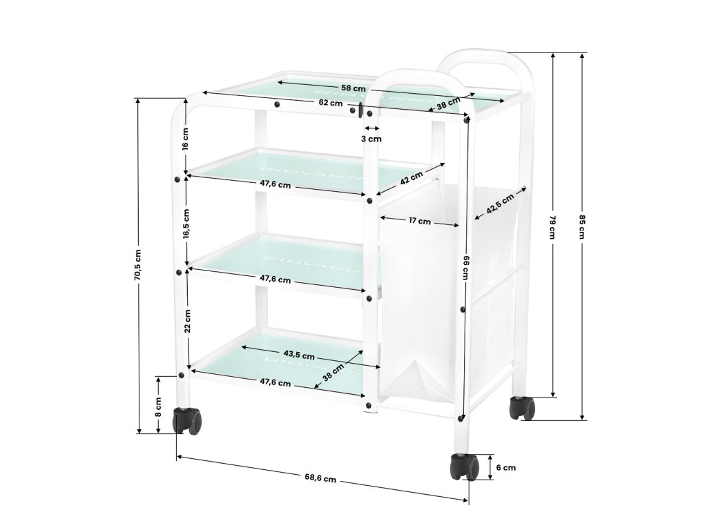 Ein besonderes Merkmal dieses Kosmetikwagens ist der integrierte Beutel für gebrauchte Handtücher oder Kosmetikbänder, der diskret am Wagen befestigt ist und Ordnung sowie Hygiene im Studioalltag unterstützt. Die vier Gummiräder ermöglichen leises und müheloses Verschieben im Raum.