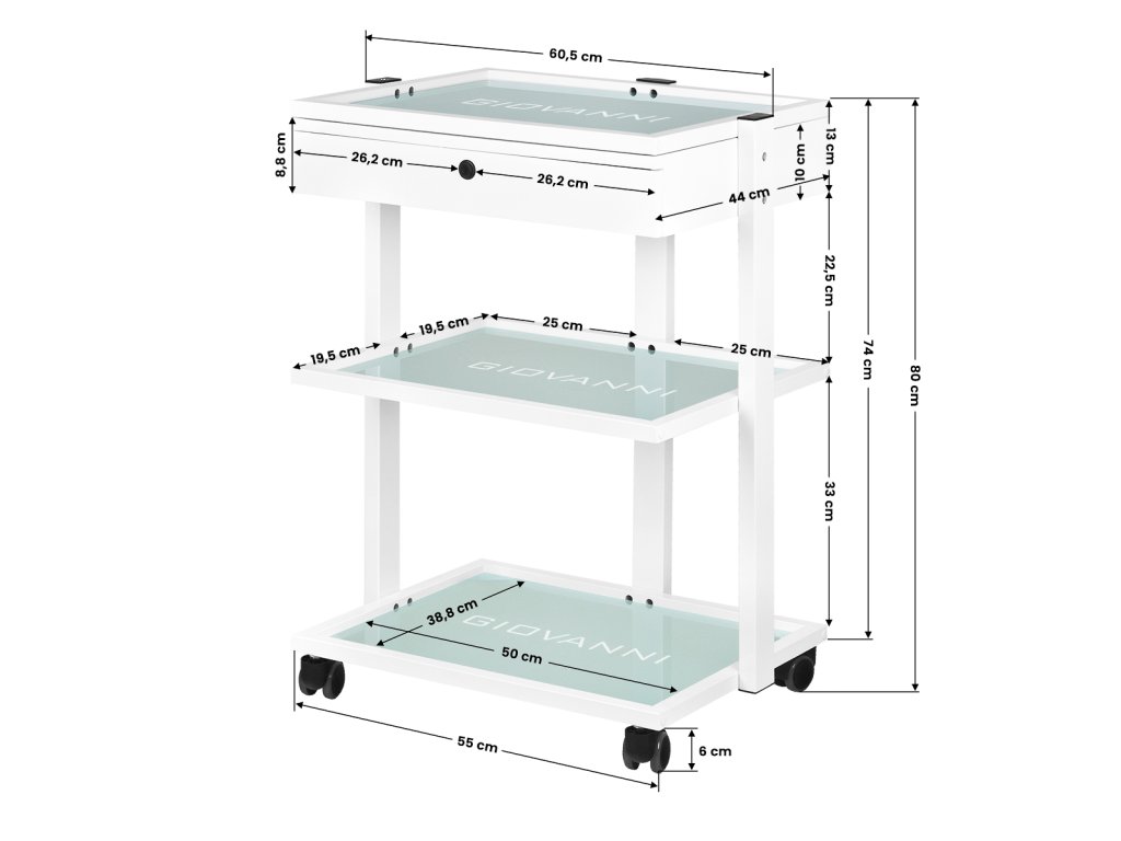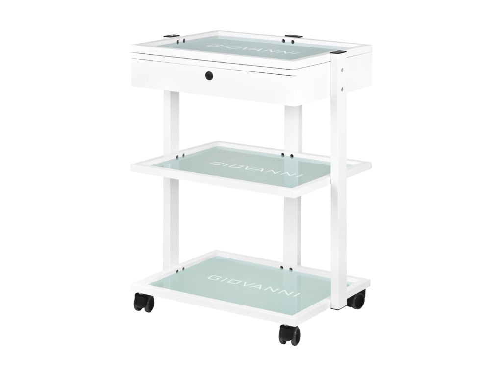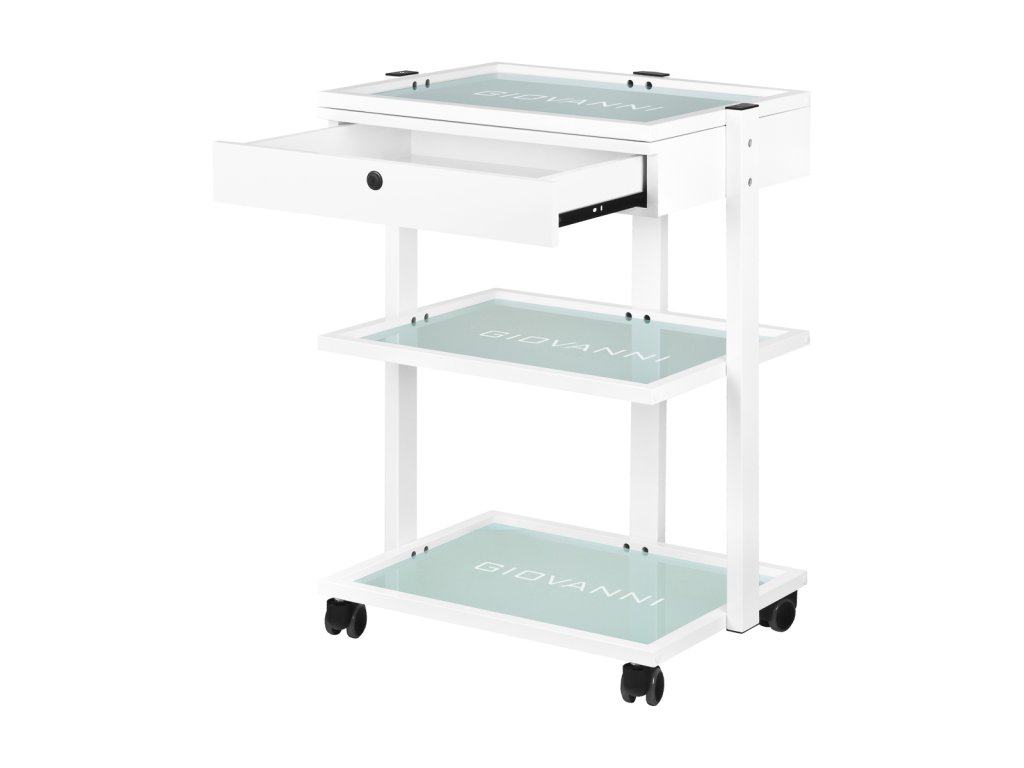 Die Kombination aus stabiler Metallkonstruktion und zwei eleganten Glasfächern mit eingraviertem GIOVANNI-Logo sorgt für ein edles, professionelles Erscheinungsbild. Die großzügige Schublade bietet zusätzlichen, geschlossenen Stauraum für Werkzeuge, Pflegeprodukte oder Zubehör.