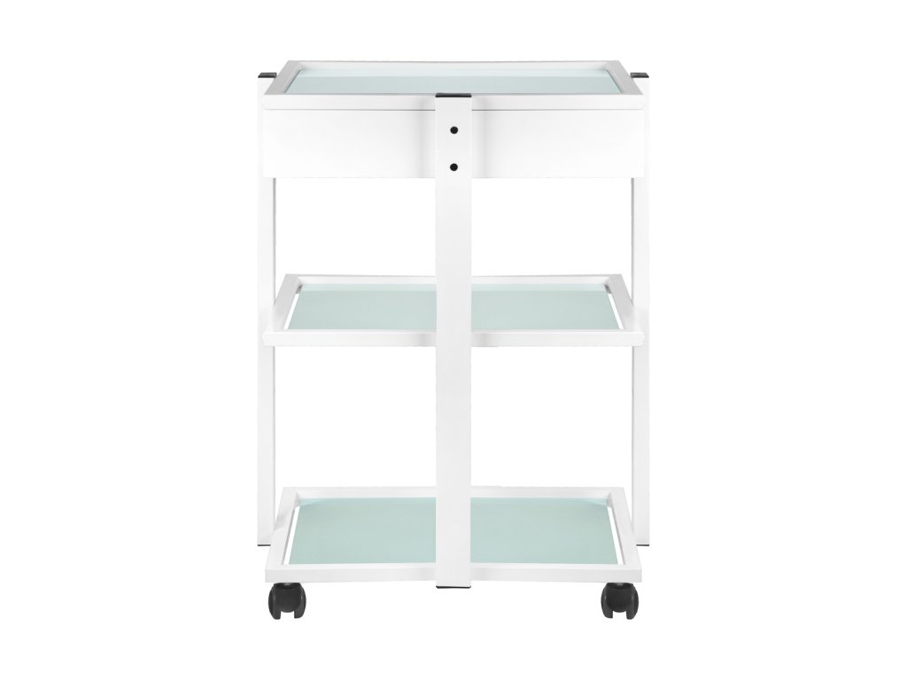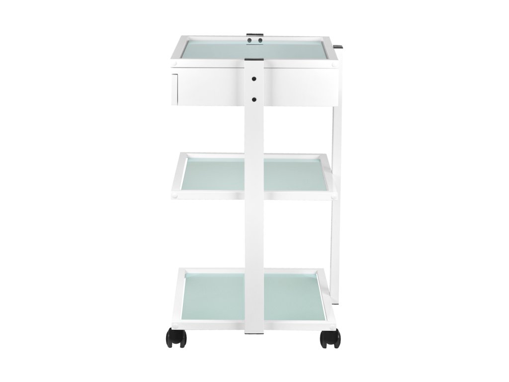 Dank der vier Gummiräder ist der Wagen mobil und leise im Einsatz. Zudem ist er für die Montage einer Lupenleuchte vorbereitet – ideal für präzise kosmetische Behandlungen. Das Design in klassischem Weiß passt perfekt in jedes Studio und unterstützt eine hygienische Arbeitsatmosphäre.