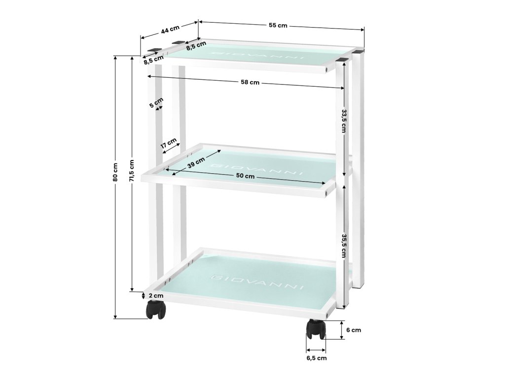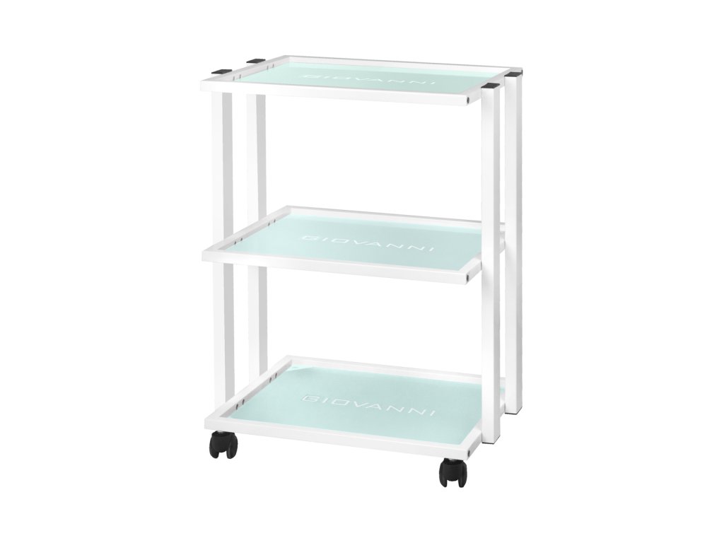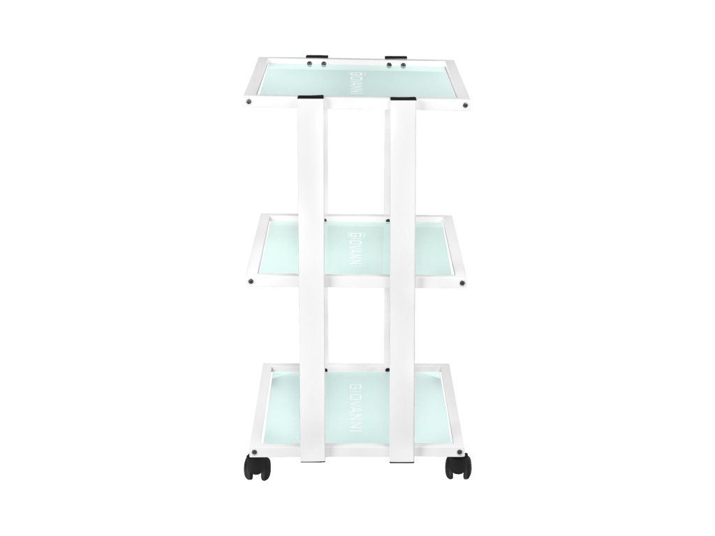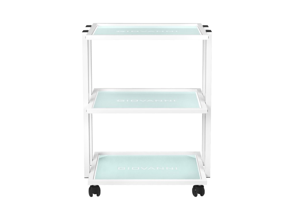 Dank seiner soliden Metallkonstruktion bietet der Wagen eine zuverlässige Basis für Kosmetikgeräte und Zubehör. Ausgestattet mit drei großen Glasfächern mit eingraviertem GIOVANNI-Logo (je 50 × 40 cm) bietet er viel Platz zur strukturierten Aufbewahrung. Die transparente Optik der Fächer unterstreicht die moderne Ästhetik und sorgt für leichte Reinigung.