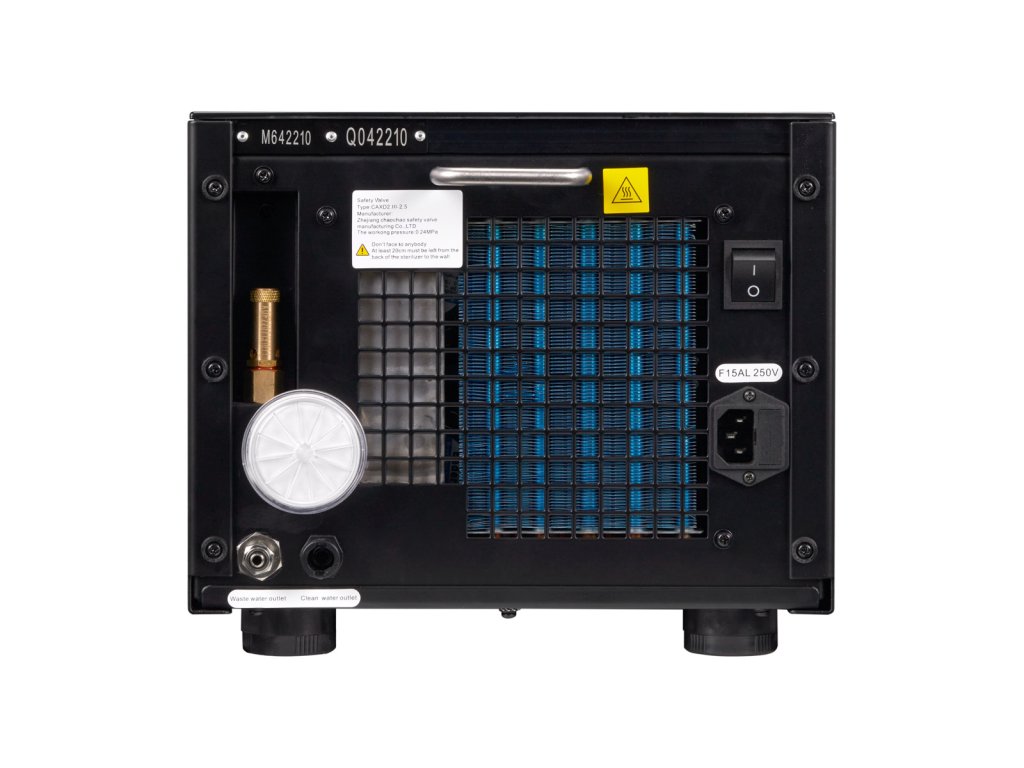 Der Autoklav ist mit einem Selbstdiagnosesystem, doppelt gesichertem Türmechanismus und einem Rein- und Abwassertank ausgestattet. Die Edelstahlkammer (304) garantiert Langlebigkeit, während das formschöne schwarze Gehäuse moderne Praxisräume ästhetisch ergänzt.