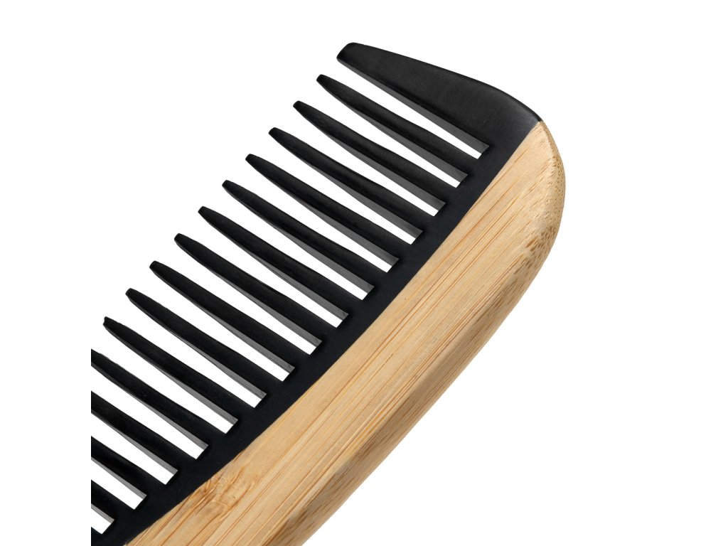 Der konturierte Griff verleiht dem Kamm ein modernes Aussehen und sorgt gleichzeitig für Leichtigkeit und Bedienkomfort. Bambus ist ein ausgezeichnetes Material – ökologisch und langlebig, widerstandsfähiger gegen Feuchtigkeit als Holz. Das breite Profil garantiert einen sicheren Halt und präzises Manövrieren während des Stylings, wodurch Sie professionelle Ergebnisse erzielen können. Der Kamm ist mit gleichmäßig verteilten Zähnen in Schwarztönen ausgestattet, die das Haar schonen, das Risiko von Schäden minimieren und ihm Glätte und Glanz verleihen.