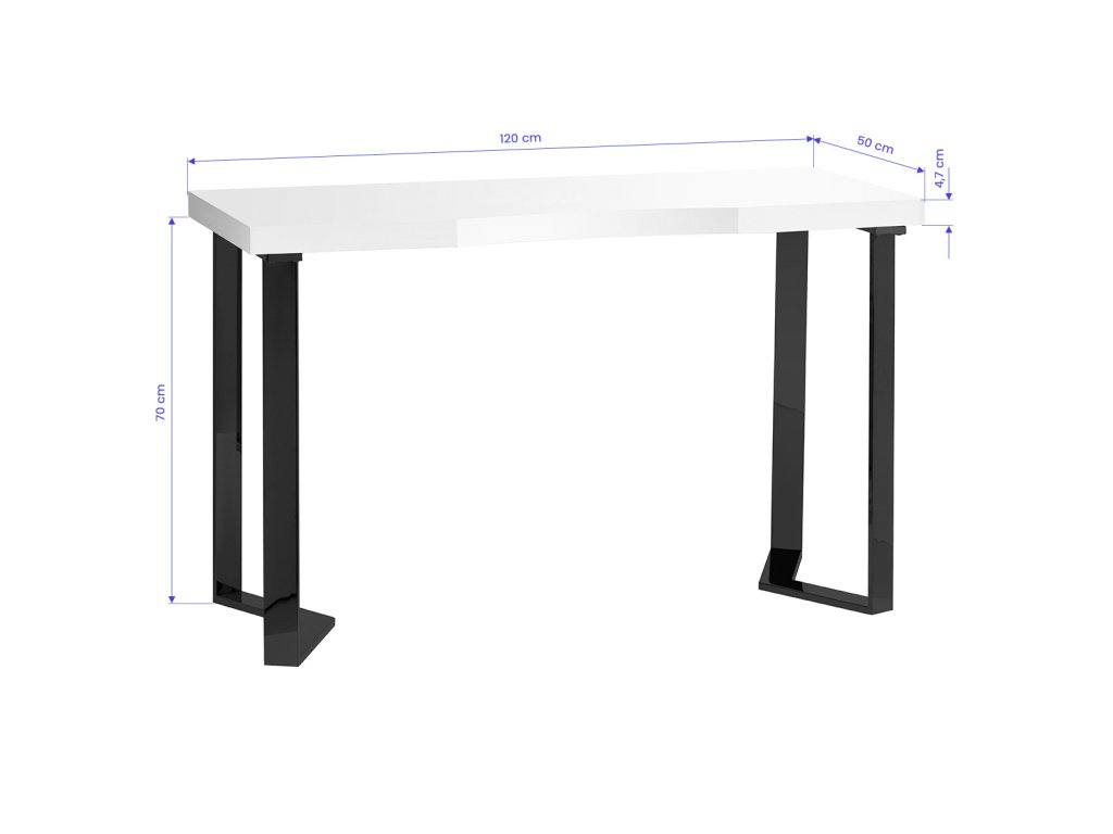 Die Kombination aus weißer Hochglanz-Arbeitsplatte und schwarzen Metallbeinen mit goldenen Details sorgt für ein modernes und elegantes Erscheinungsbild. Der Tisch fügt sich harmonisch in moderne Studioeinrichtungen ein.