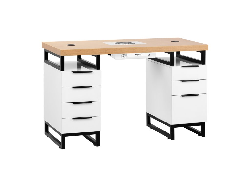 Der Nageltisch Momo L02 mit eingebautem Kassetten-Staubabscheider Momo J-02 ist die perfekte Kombination aus Funktionalität und modernem Industrie-Design. Die massive Metallkonstruktion sorgt für Stabilität, während die großzügige Arbeitsfläche in Holzoptik einen eleganten Kontrast zu den weißen Fronten und schwarzen Details bildet.