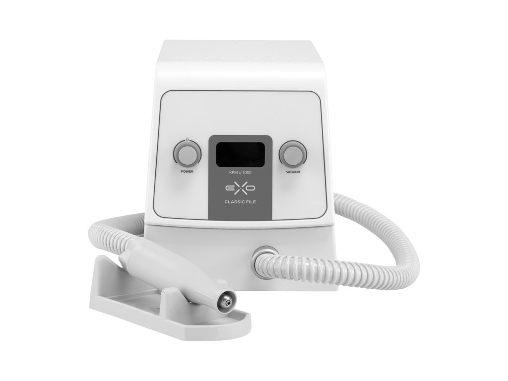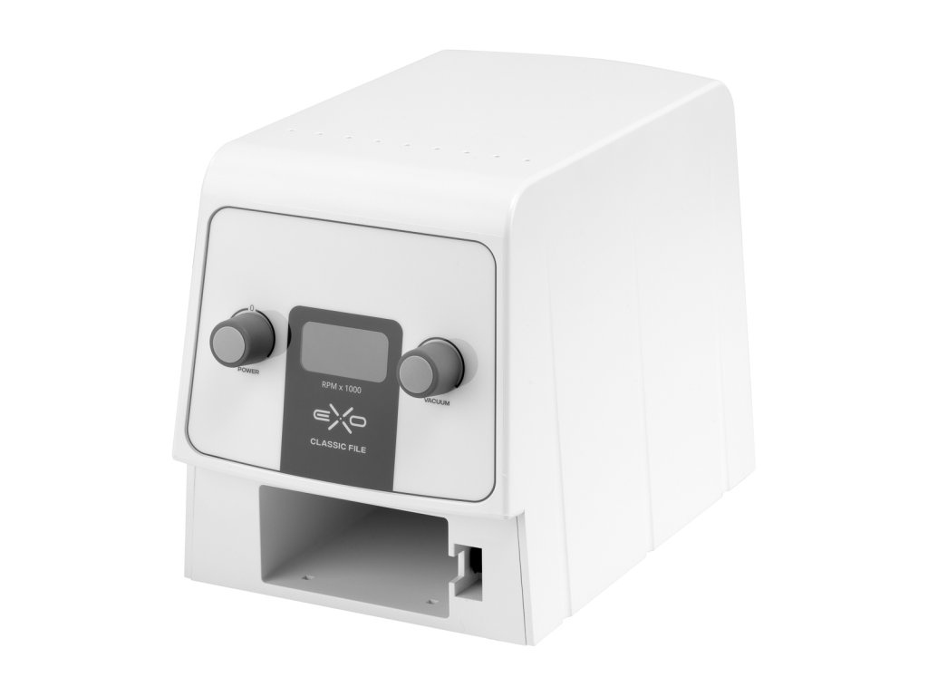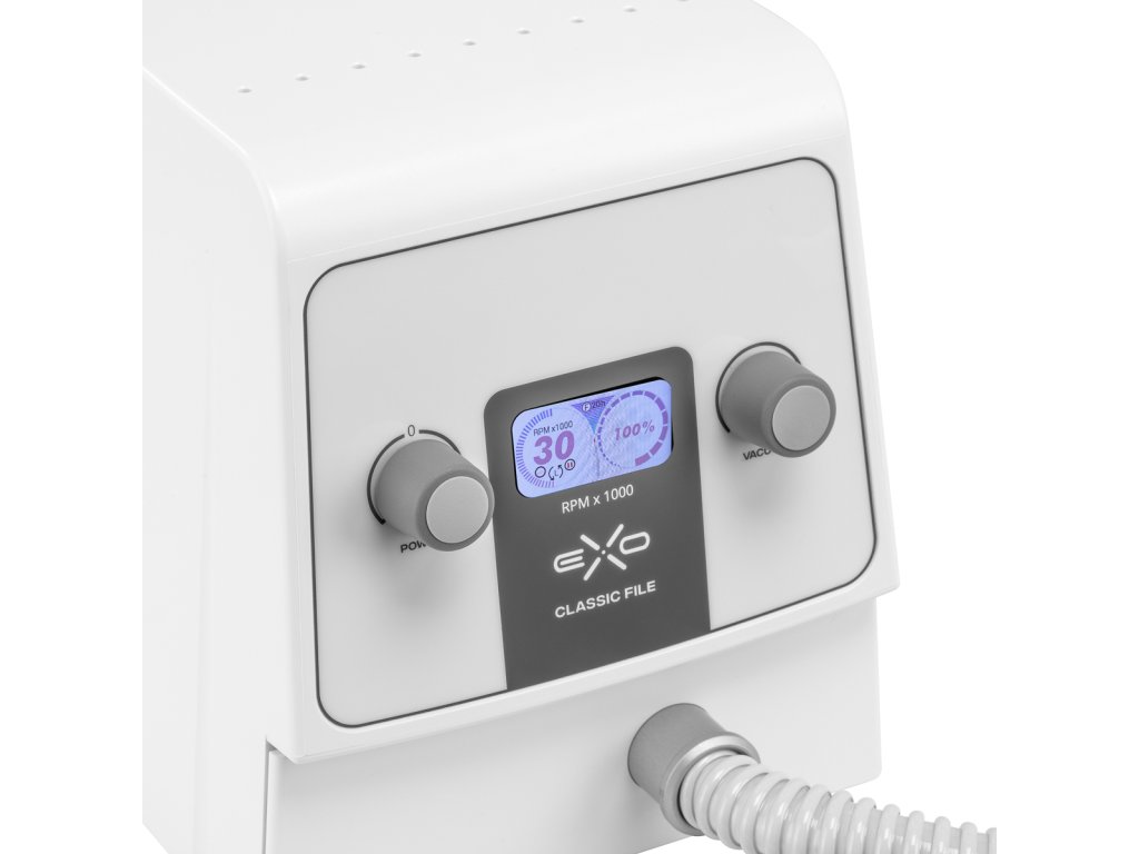 Der Exo Classic File New Edition ist ein professioneller Podologie-Nagelfräser mit eingebautem Absorber, der höchsten hygienischen und funktionalen Ansprüchen gerecht wird. Er eignet sich perfekt für die trockene Pediküre, podologische Behandlungen und Maniküre. Der ergonomische Mikromotor-Kopf garantiert vibrationsfreies Arbeiten bei bis zu 30.000 U/min, während der Absorber mit 20-stufiger Einstellung zuverlässig den bei der Behandlung entstehenden Staub filtert.