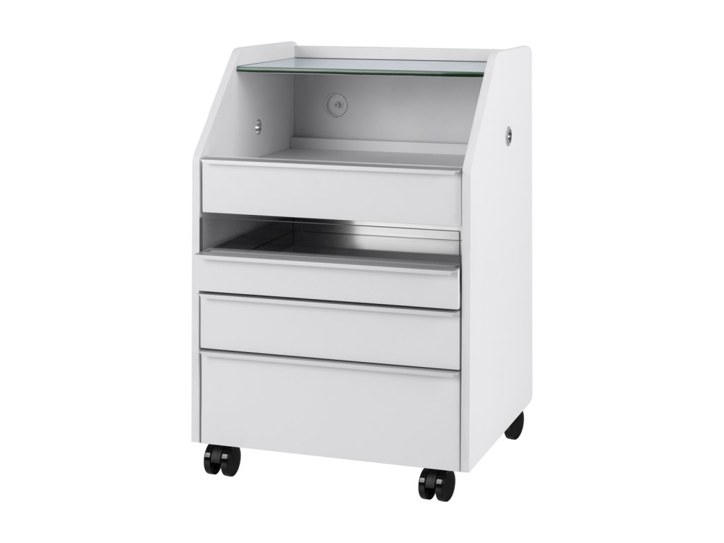 Die intelligente Aufteilung des Stauraums erleichtert den Arbeitsalltag erheblich. Die obere Glasablage bietet Platz für häufig benötigte Instrumente und Hilfsmittel, während vier Schubladen in verschiedenen Größen eine strukturierte Aufbewahrung von Werkzeugen, Kosmetikprodukten und Verbrauchsmaterial ermöglichen. Eine der Schubladen ist mit einem Spiegelboden und einem integrierten Organizer ausgestattet, was die Übersichtlichkeit erhöht und den schnellen Zugriff auf Instrumente während der Behandlung erleichtert.