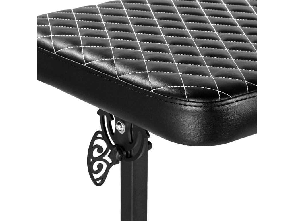 Ein solider Rahmen in Schwarztönen aus Metall sorgt für Stabilität und Haltbarkeit der Armlehne, was bei der Arbeit eines Tätowierers äußerst wichtig ist. Die Kunstlederpolsterung in Schwarztönen mit eleganter weißer Steppung sorgt für eine leichte Reinigung der Geräte. Das moderne Design wird die Inneneinrichtung des Tattoo-Studios attraktiver machen und den einzigartigen Charakter des Ortes betonen. Eine Kombination aus Komfort, Funktionalität und Stil, die sowohl Profis als auch Kunden von Tattoo-Studios gefallen wird. Die Armlehne erleichtert die Arbeit erheblich, trägt aber auch dazu bei, eine angenehme Atmosphäre im Wohnzimmer zu schaffen und unterstreicht dessen Atmosphäre.