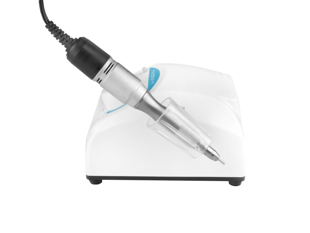 Es funktioniert gut in Schönheits- und Podologiesalons und eignet sich für prothetische Arbeiten. Der Kopf ist so konstruiert, dass sein oberer Teil entfernt und in einem Autoklaven sterilisiert werden kann. Der Fräsmaschinensockel ist einfach und intuitiv zu bedienen. Der stufenlos verstellbare Knopf ermöglicht es Ihnen, die Intensität der Drehung im Bereich von 0 bis zu 40 Tausend zu wählen.