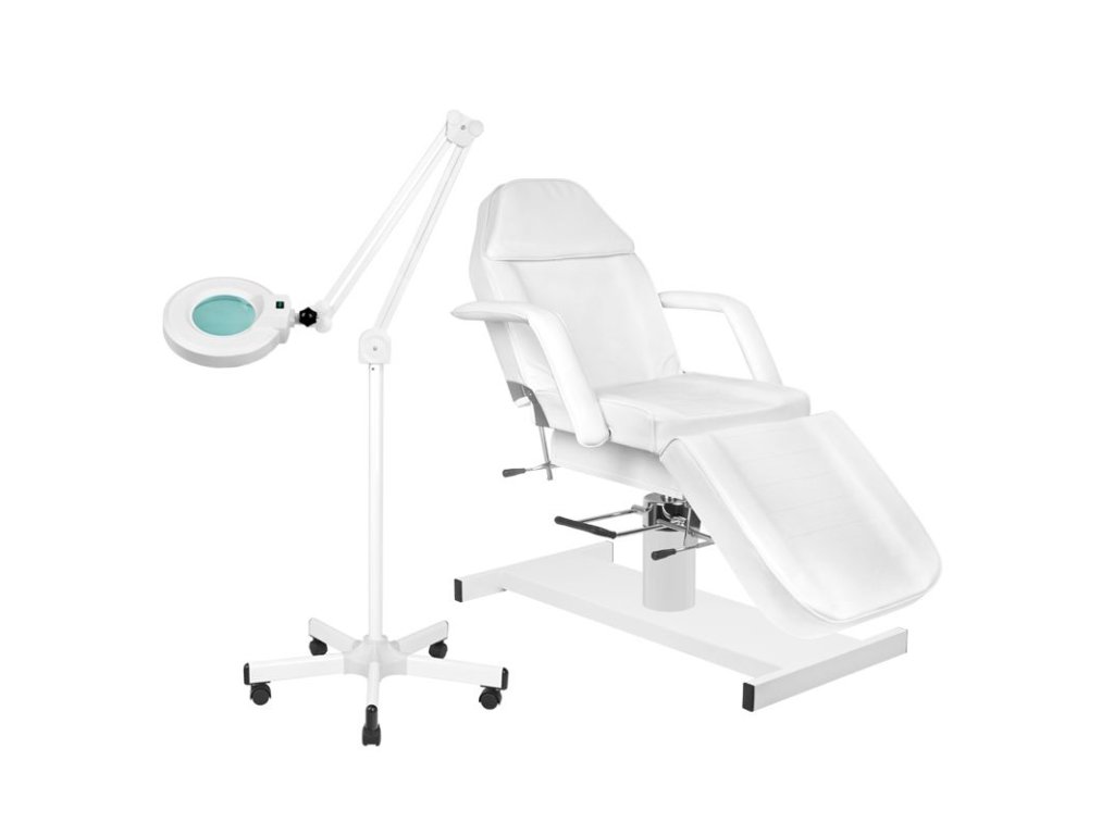 Set: Hydraulische Kosmetikliege A-210 + Lupenlampe S5Eine hydraulisch verstellbare Dreh-Kosmetikliege (oben - unten) mit einer Verriegelung,