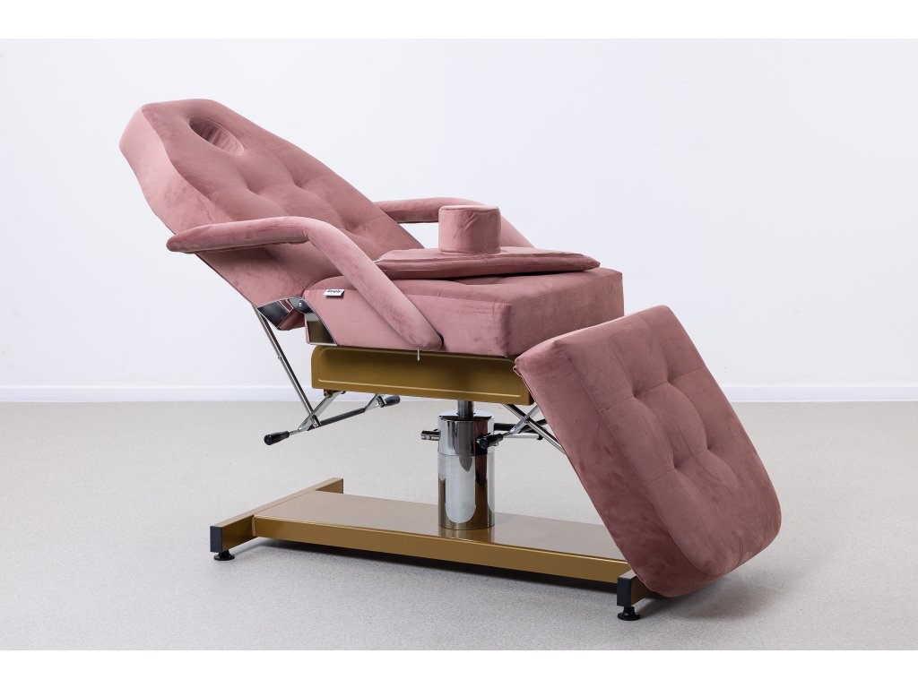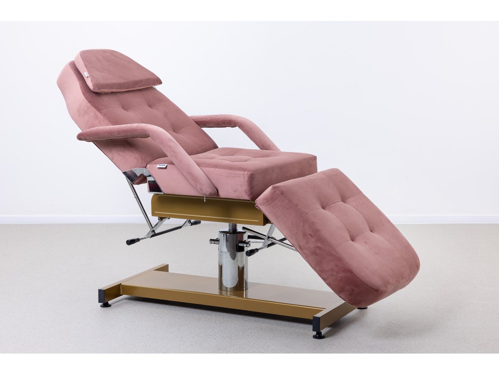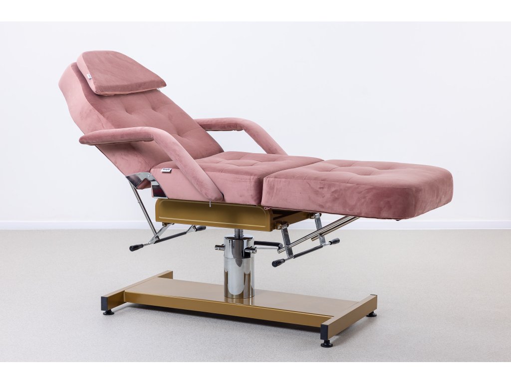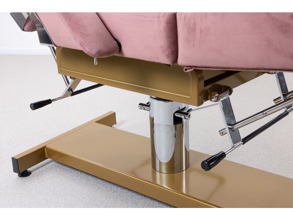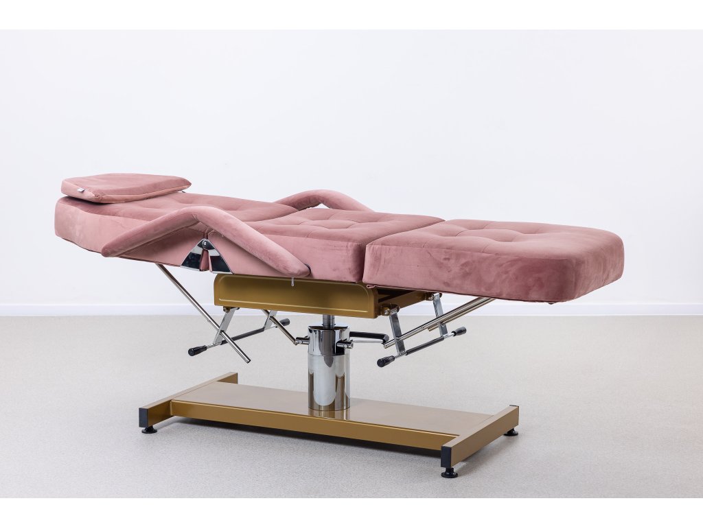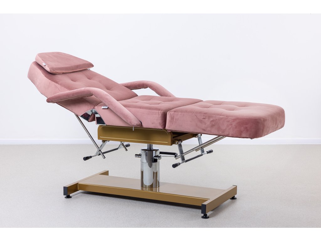 Die Liege ist drehbar und mit einer Arretierung ausgestattet. Die Höhe lässt sich hydraulisch von 64 bis 80 cm verstellen.