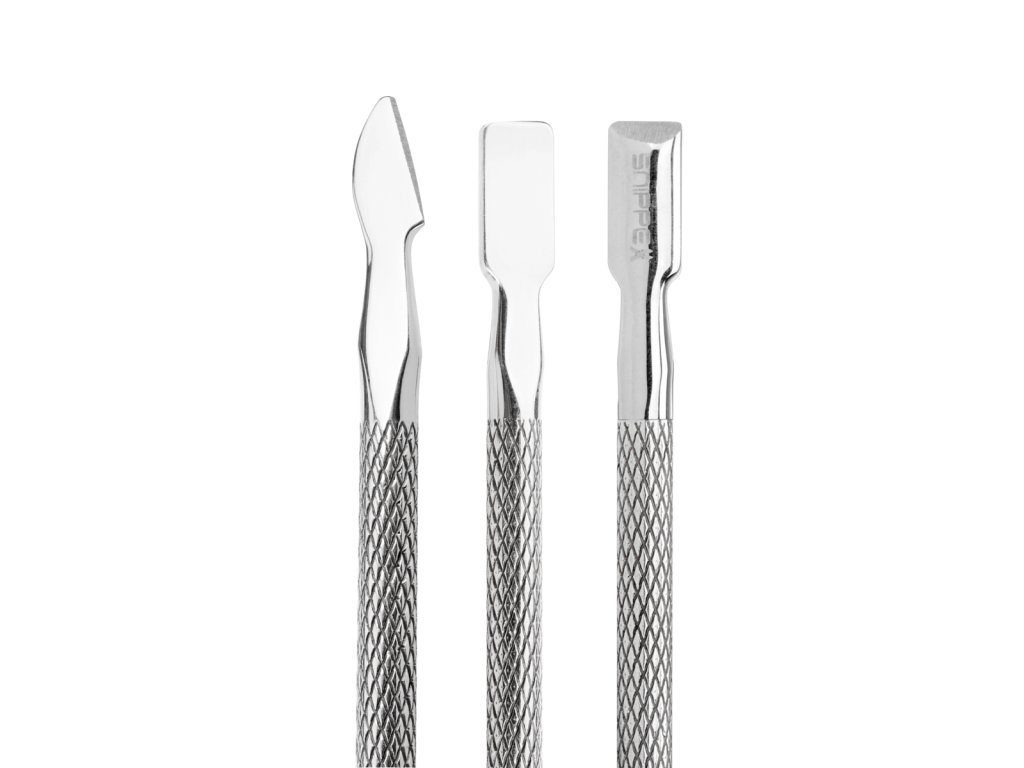 • Ein Meißelmesser wird verwendet, um Nagelhaut zu schneiden, insbesondere von den Seiten der Nagelplatte. Die Profilierung der Spitze erleichtert ein präzises Arbeiten.