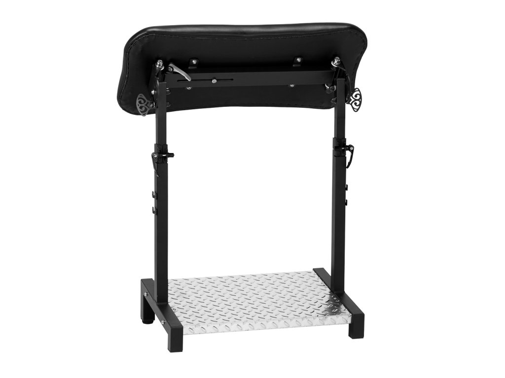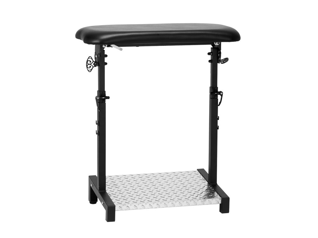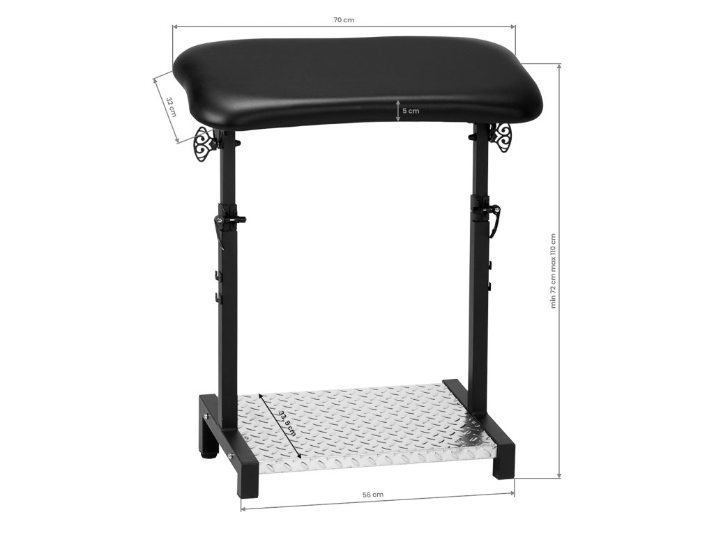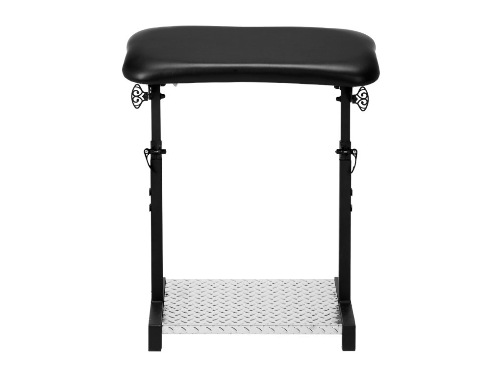 Die Höhe der Armlehne kann von 72-110 cm eingestellt werden, wodurch sie an verschiedene Kunden angepasst werden kann und eine optimale Unterstützung während der Tattoo-Sitzung garantiert. Dieses Modell ist mit einer Fußstütze aus Metall ausgestattet, die dazu beiträgt, eine ergonomische Position der Person einzunehmen, die die Tätowierung durchführt. Die seitliche Neigungsverstellung erleichtert das Einstellen der Position der Armlehne für noch mehr Komfort beim Tätowieren. Ein wichtiges Merkmal dieses Modells ist die Möglichkeit der unabhängigen Höhenverstellung beider Seiten der Armlehne, die durch ein spezielles Schiebeelement von unten bereitgestellt wird. Eine Vielzahl von Einstellmöglichkeiten wirkt sich erheblich auf die Ergonomie der Arbeit und den Komfort des Kunden aus.