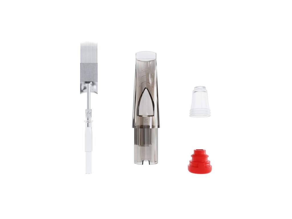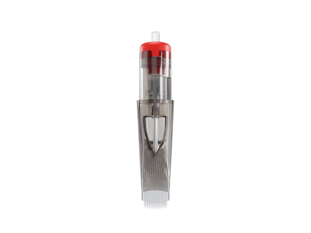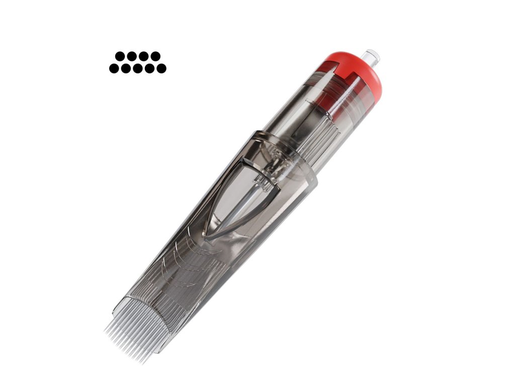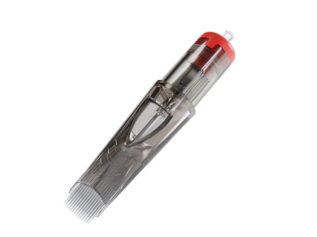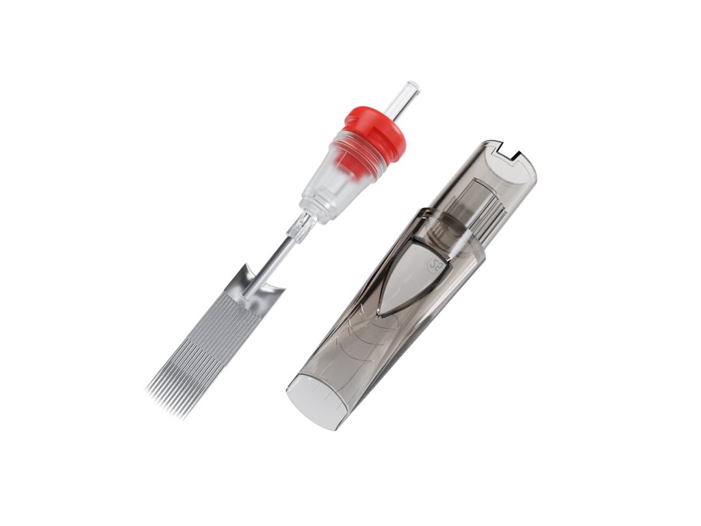 Das flache Magnum-Design mit leicht gebogener Form ermöglicht eine gleichmäßige Pigmentverteilung auf größeren Hautpartien und sorgt für geschmeidige Farbübergänge. Die Nadeln sind aus chirurgischem Edelstahl gefertigt und in einem widerstandsfähigen, medizinischen Kunststoffgehäuse mit patentiertem Stabilisierungssystem eingebettet – für maximale Sicherheit, minimale Vibration und eine ruhigere Handhabung.