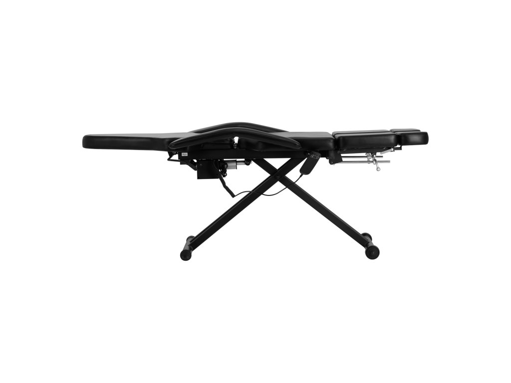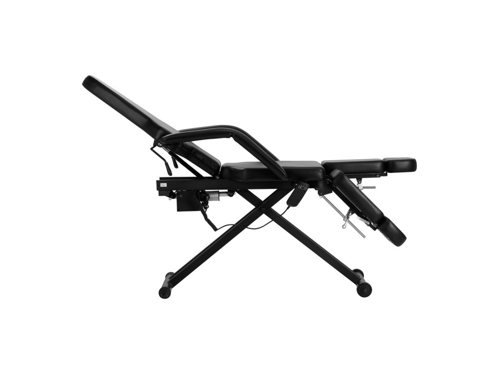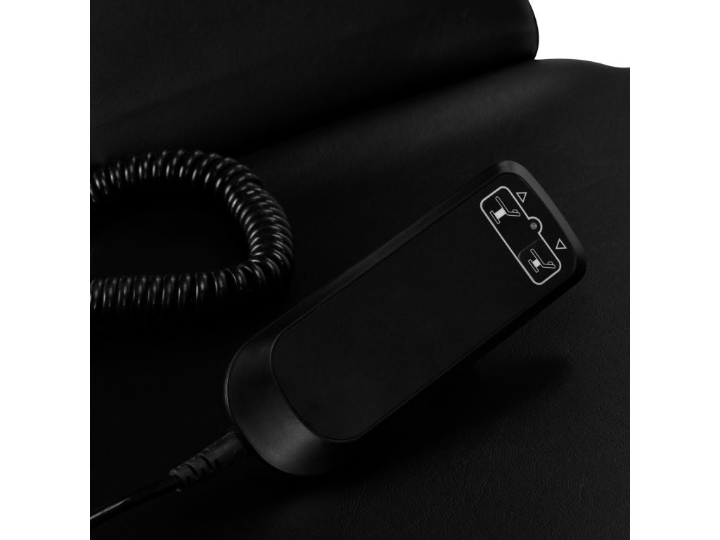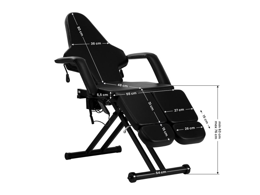 Der Stuhl verfügt über fortschrittliche Mechanismen, die es ermöglichen, ihn an die Bedürfnisse und Besonderheiten der Tätowierindustrie anzupassen. Die Höhe ist im Bereich von 63-76 cm mit einem elektrischen Antrieb einstellbar, der über eine einfach zu bedienende kabelgebundene Fernbedienung gesteuert wird. Auf der rechten Seite des Sitzes befindet sich ein Metallgriff zum Aufhängen der Fernbedienung, damit sie die Behandlung nicht stört und immer griffbereit ist.