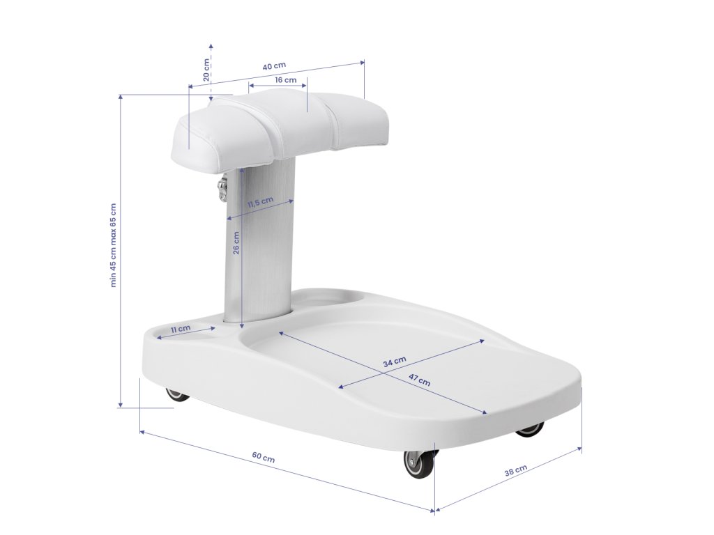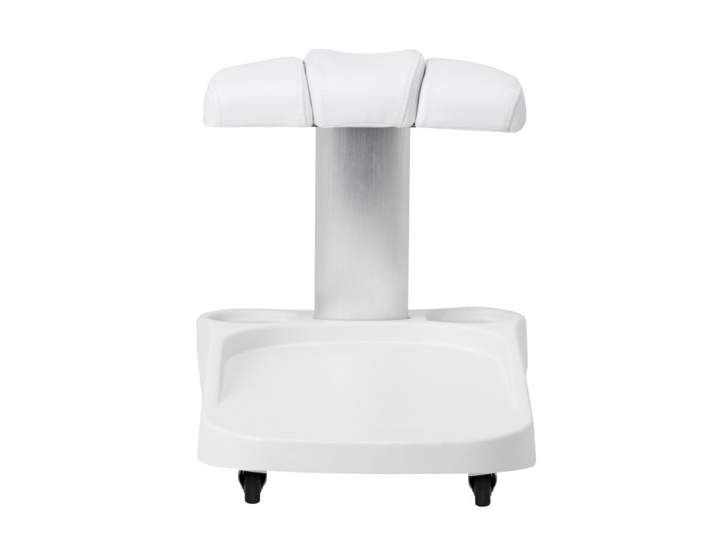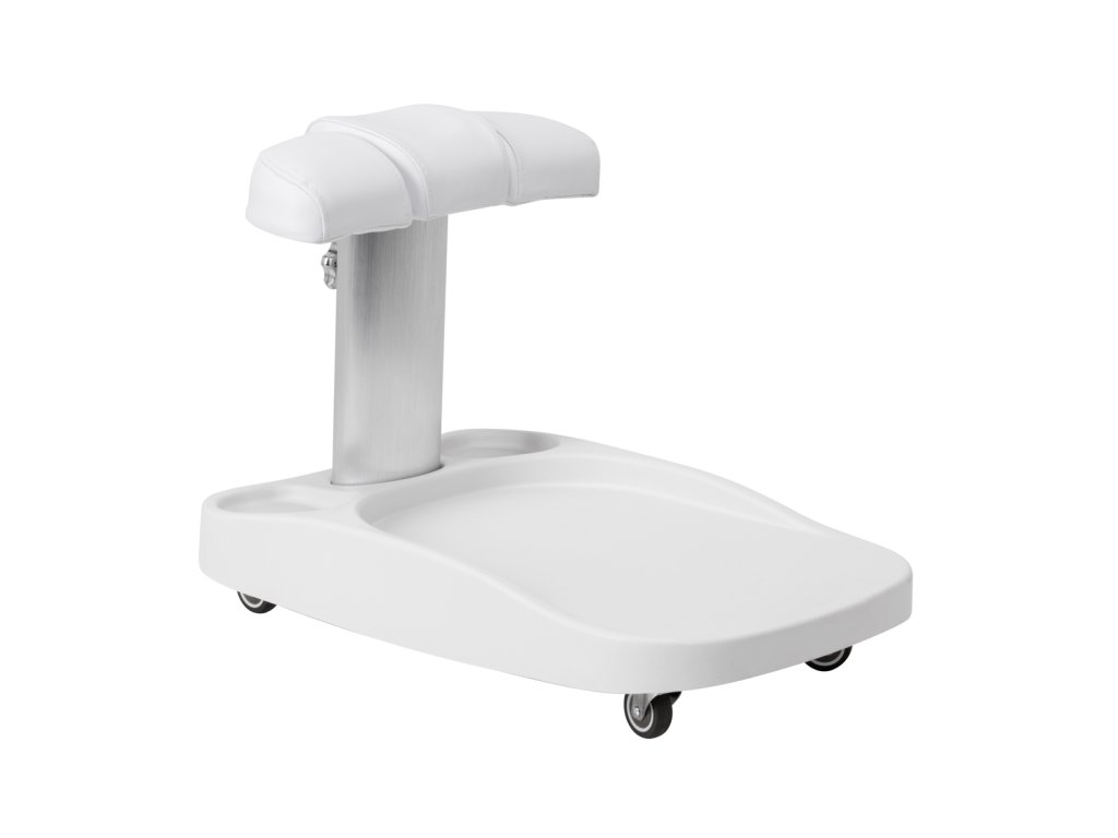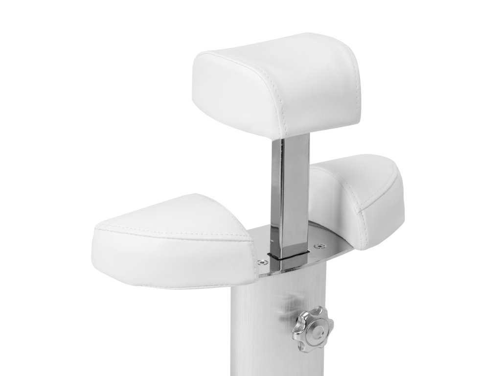 Die Fußstütze besteht aus drei Teilen, von denen der mittlere ausziehbar ist. Die manuelle Höhenverstellung ermöglicht eine Erhöhung um bis zu 20 cm. Alle Teile der Fußstütze sind mit Kunstleder bezogen, was sie feuchtigkeitsbeständig und pflegeleicht macht. Dadurch kann der Wagen individuell angepasst werden und ist sowohl bei kosmetischen als auch bei podologischen Behandlungen eine hervorragende Wahl, die Komfort und Präzision in verschiedenen Positionen bietet.