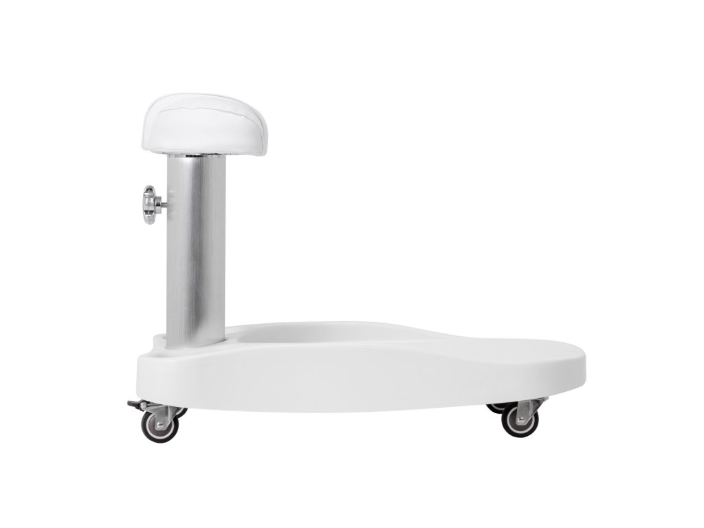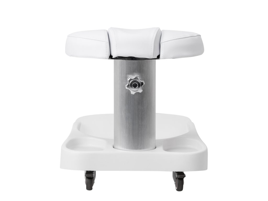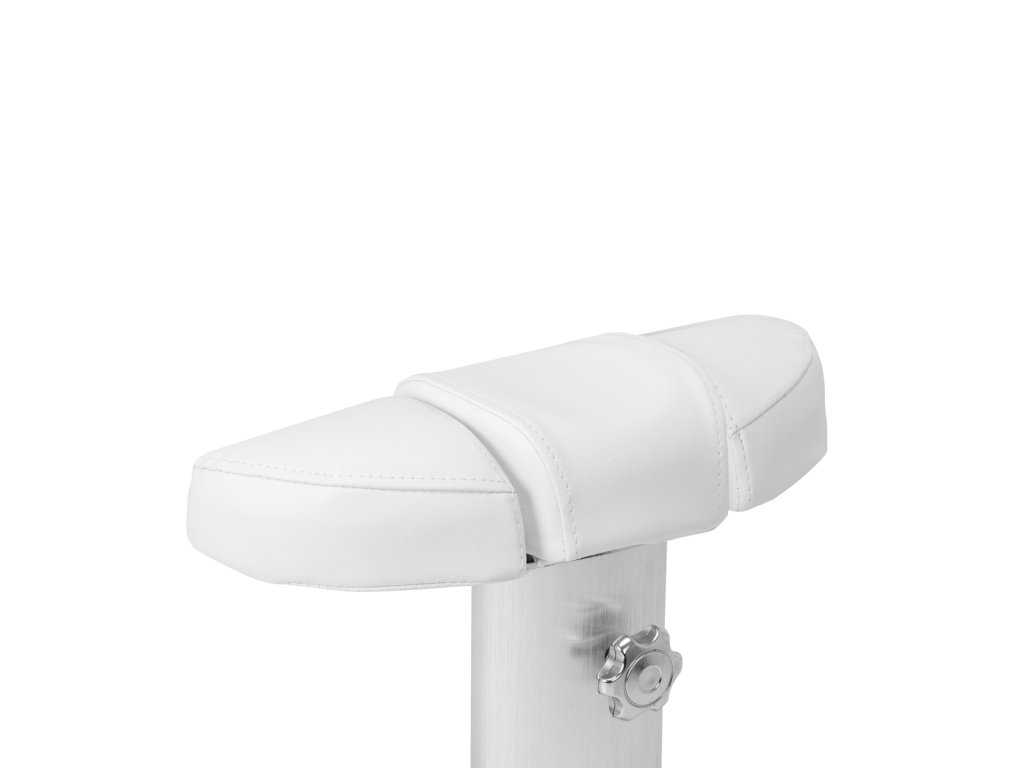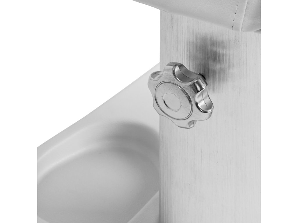 Die Fußstütze besteht aus drei Teilen, von denen der mittlere ausziehbar ist. Die manuelle Höhenverstellung ermöglicht eine Erhöhung um bis zu 20 cm. Alle Teile der Fußstütze sind mit Kunstleder bezogen, was sie feuchtigkeitsbeständig und pflegeleicht macht. Dadurch kann der Wagen individuell angepasst werden und ist sowohl bei kosmetischen als auch bei podologischen Behandlungen eine hervorragende Wahl, die Komfort und Präzision in verschiedenen Positionen bietet.