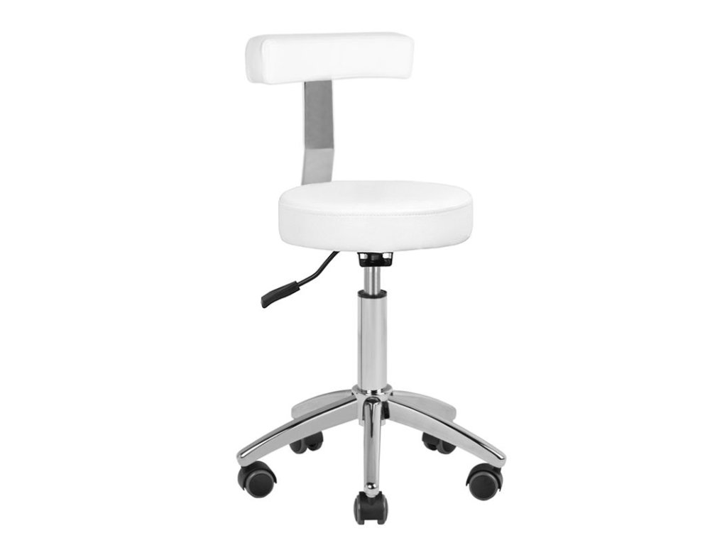 Wygodny taboret kosmetyczny, stabilny na pięcioramiennej podstawie, z gumowanymi kółkami, z możliwością demontażu oparcia, w kolorze białym, niezbędny mebel w gabinecie kosmetycznym.